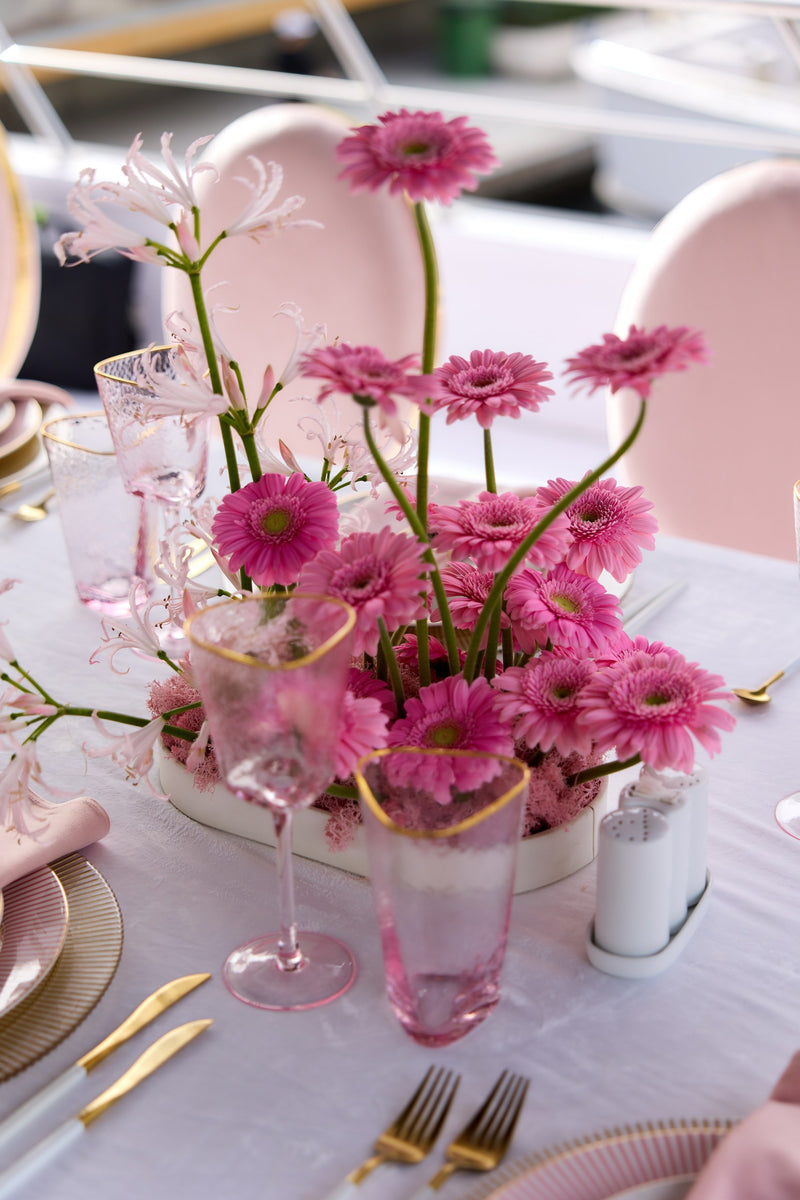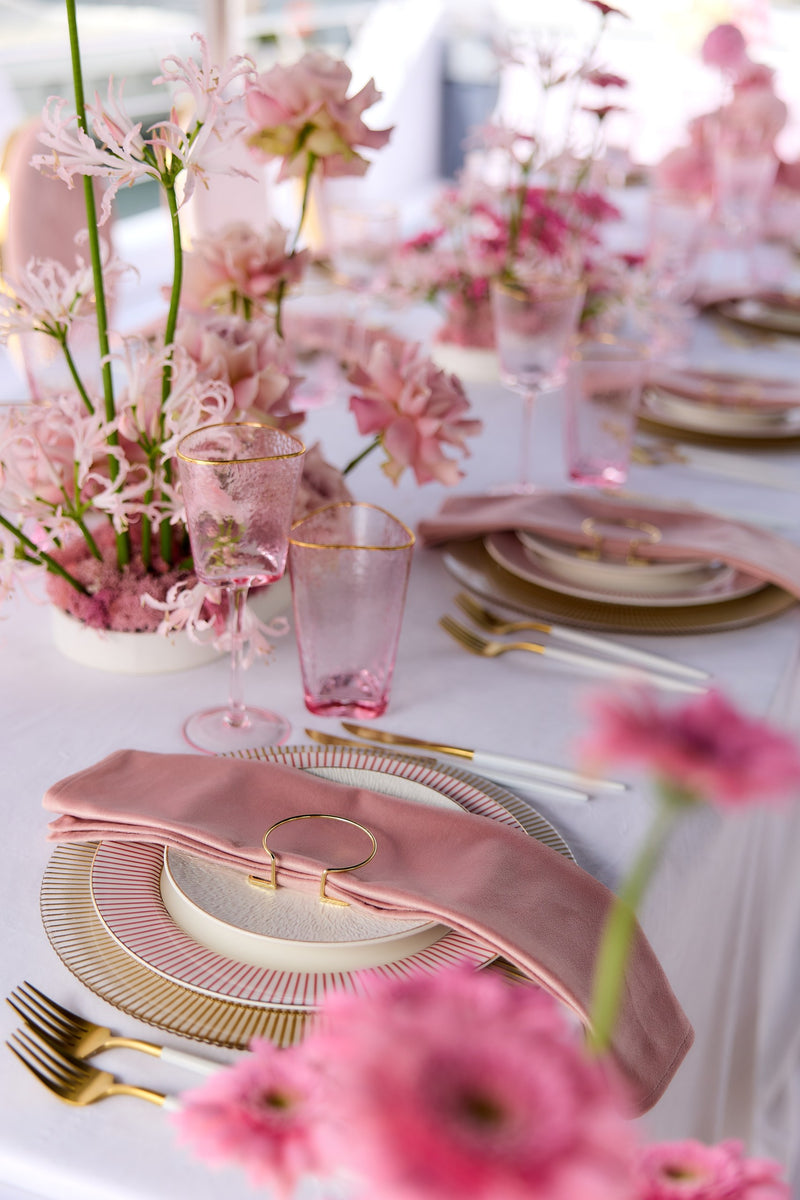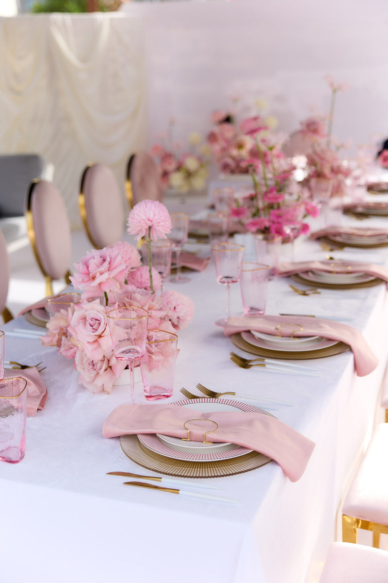 Table arrangements echo the ceremony structures—delicate, feminine and light.