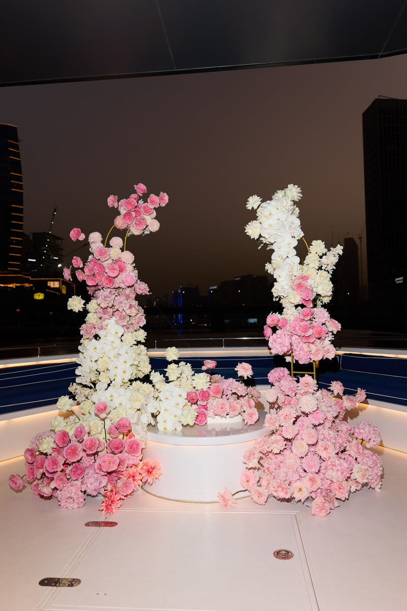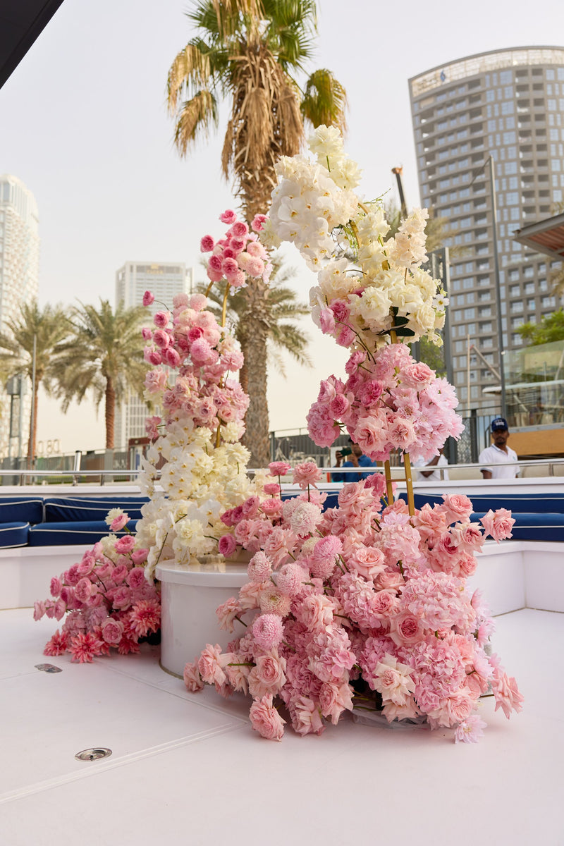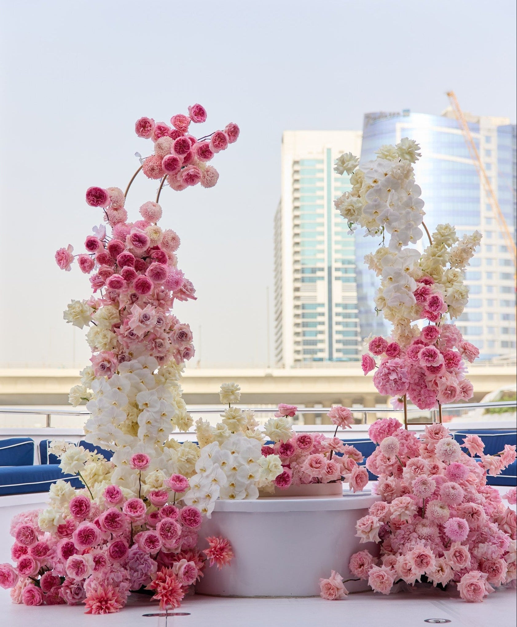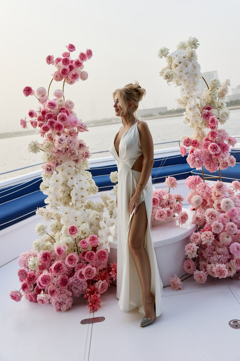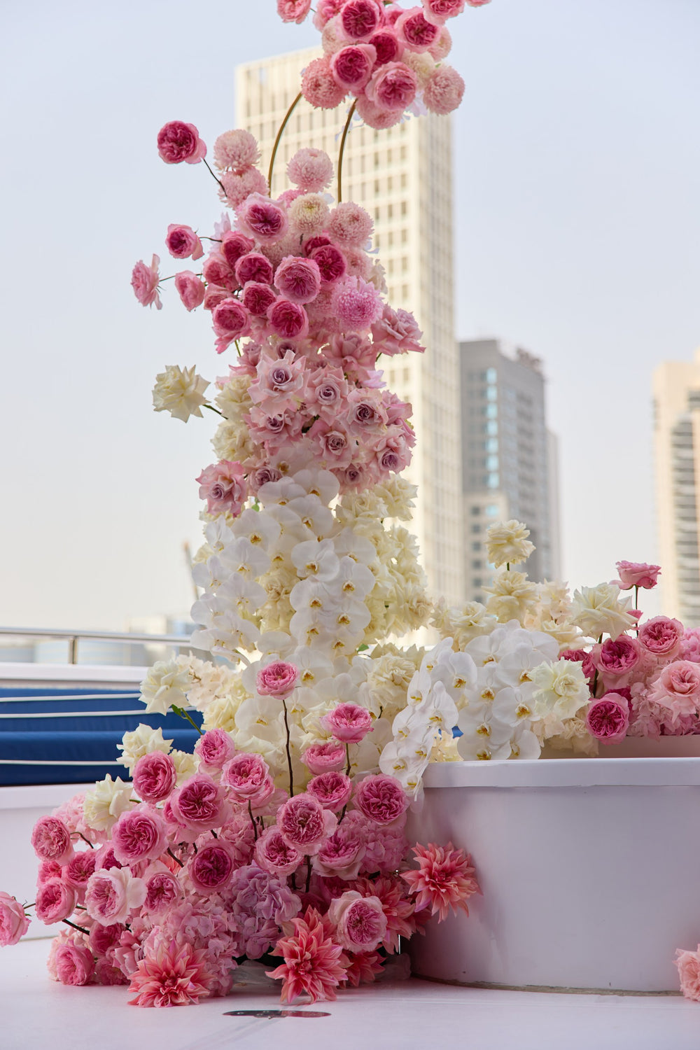 Soft clouds of garden roses, orchids and seasonal blooms flow across the deck, turning the yacht into a floating garden.